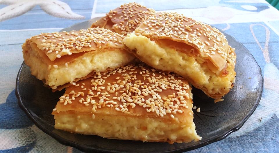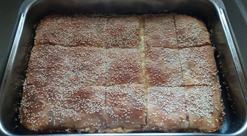 Λαδώνω το ταψί μου (26×36 εκ.) και βάζω στον πάτο τα 3 μισά φύλλα, τα οποία έχω λαδώσει καλά με το πινέλο. Στρώνω ομοιόμορφα τη γέμιση και στη συνέχεια σκεπάζω με τα υπόλοιπα 3 μισά φύλλα, τα οποία επίσης έχω λαδώσει. Τέλος, πασπαλίζω την επιφάνεια με μπόλικο σουσάμι και ψήνω σε προθερμασμένο φούρνο στους 200 βαθμούς για μία ώρα περίπου.