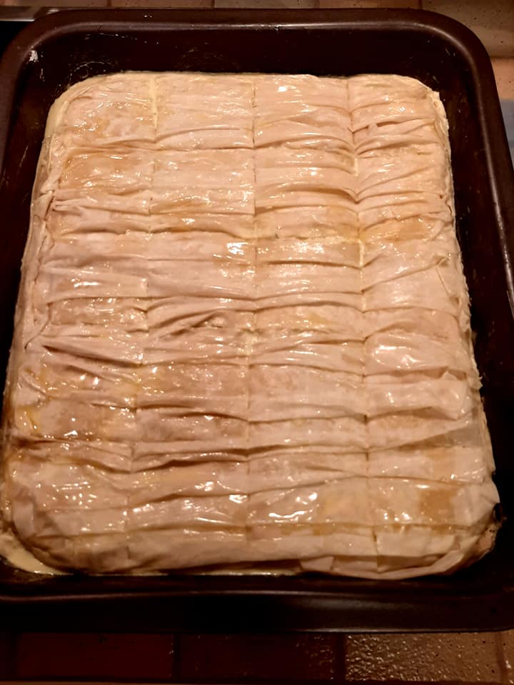 Απλώνουμε 5 φύλλα ελαφρά βουτυρώνοντάς τα σε ταψί κάτω, τη μισή γέμιση, 3 φύλλα , την υπόλοιπη γέμιση κ τα υπόλοιπα φύλλα ελαφρά τσαλακωτά όπως στη φωτογραφία και την σφραγιζουμε γυρω γύρω.