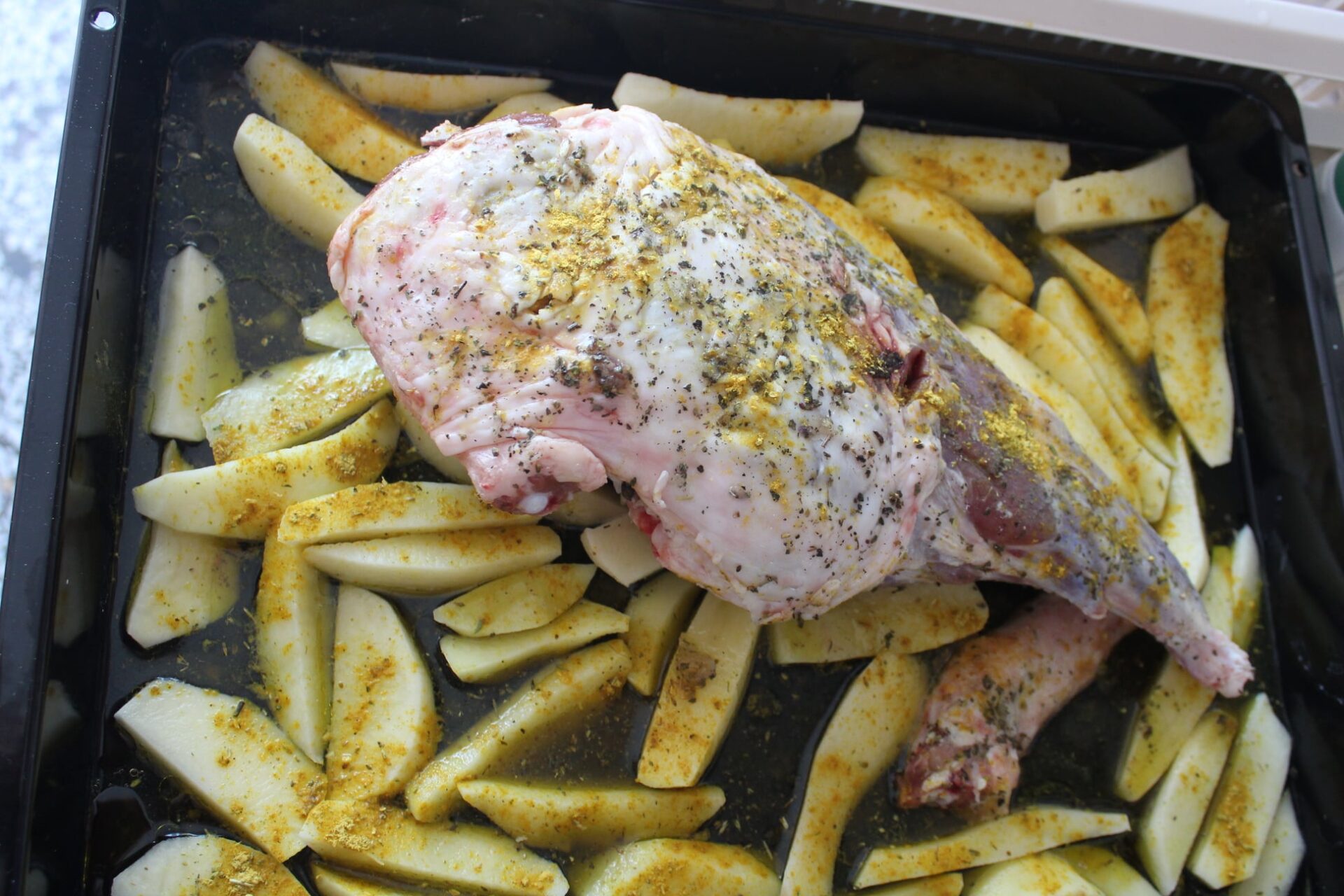Τοποθετούμε τις πατάτες σε ένα ταψί ή αν έχουμε μεγάλη γάστρα, το μπούτι, και προσθέτουμε ελαιόλαδο χυμό απο ένα μέτριο λεμόνι(προαιρετικά) και 1 1/2 ποτήρι νερό.
