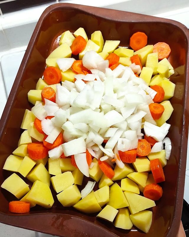 Το αφήνουμε στο ψυγείο για 1 ώρα και μετά ψιλοκόβουμε τα λαχανικά, προσθέτουμε λάδι και αλάτι σε ένα βαθύ μπολ, τα ανακατεύουμε και τα αδειάζουμε στο ταψί.