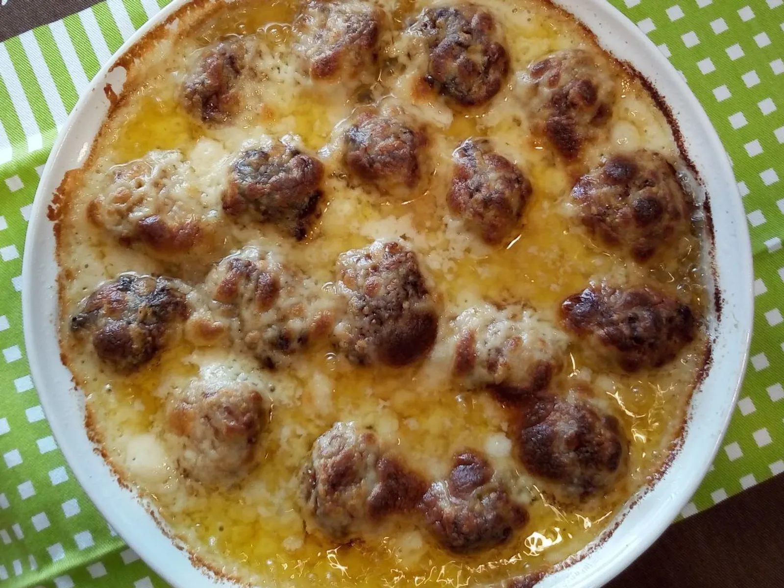 3. Τοποθετούμε τα κεφτεδάκια σε ένα ταψί και τα καλύπτουμε με τη σάλτσα τυριού.