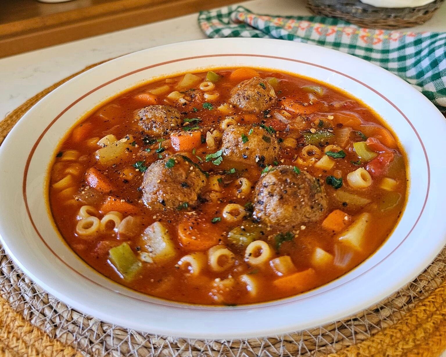 Αυτή η χορταστική, κεφτεδόσουπα κοφτό μακαρονάκι είναι εύκολο να γίνει με τρυφερά, ζουμερά κεφτεδάκια, λαχανικά και ζυμαρικά σιγοβρασμένα σε έναν πλούσιο ζωμό ντομάτας. Αν η οικογένειά σας αγαπά τα κεφτεδάκια όσο η δική μου, θα λατρέψει αυτή τη σούπα!