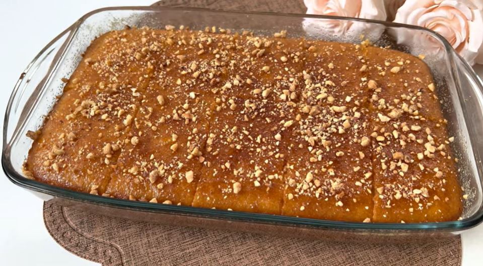 Βγάζουμε το πυρέξ απ τον φούρνο και περιχύνουμε με το σιρόπι σιγά σιγά να πάει παντού.Πασπαλίζουμε με τα αμύγδαλα κόβουμε και σερβίρουμε.