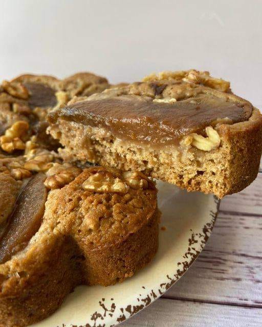 4- Τοποθετήστε το άλλο μισό αχλάδι κομμένο από πάνω, πασπαλίστε λίγη ποσότητα ζάχαρης και προαιρετικά ψιλοκομμένους ξηρούς καρπούς.