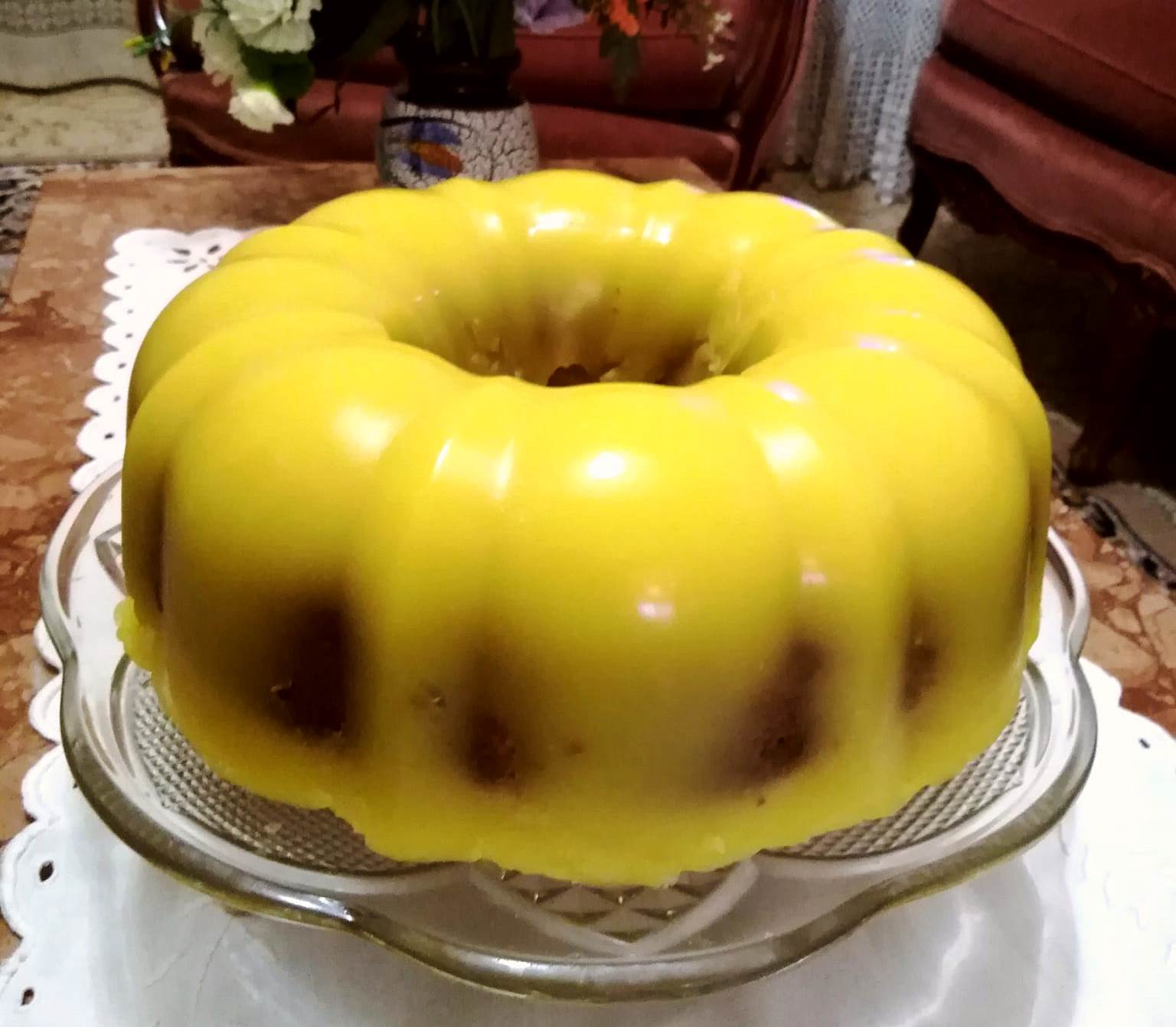 Μόλις πήξει η κρεμα στο κατσαρολάκι που βραζουμε τα υλικά, περισσότερη από τη μισή κρέμα την αδειάζουμε στη φόρμα και αμέσως βάζουμε το κέικ, το πιεζουμε ελαφρά και προσθέτουμε την υπόλοιπη κρέμα. Το αφήνουμε σε δροσερό μέρος για 5/6 ώρες. Στη συνέχεια, γυρίστε το έτοιμο κέικ στο ταψί.