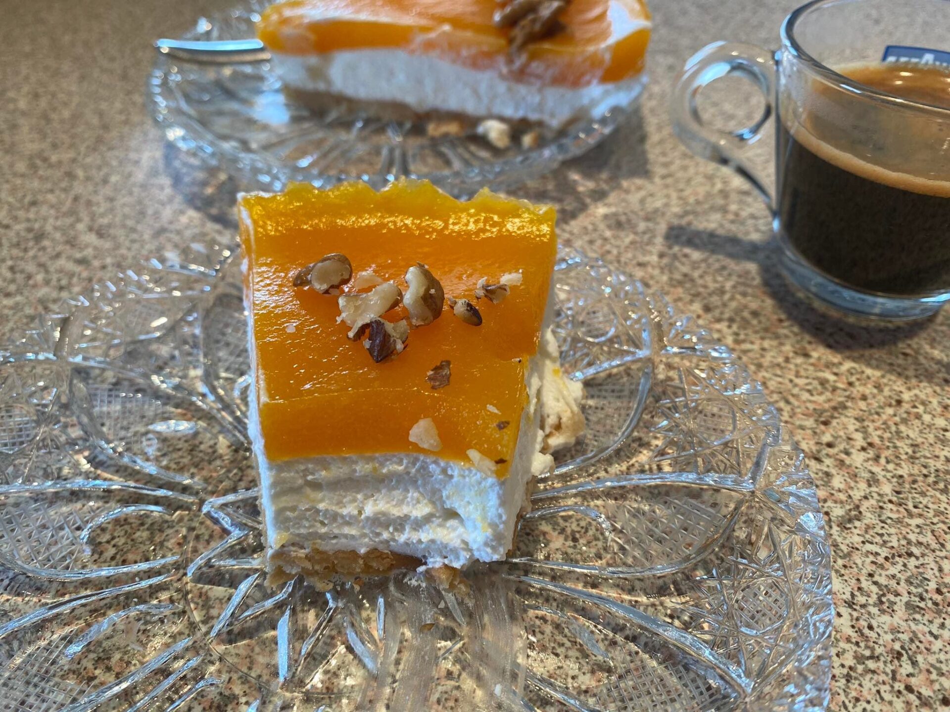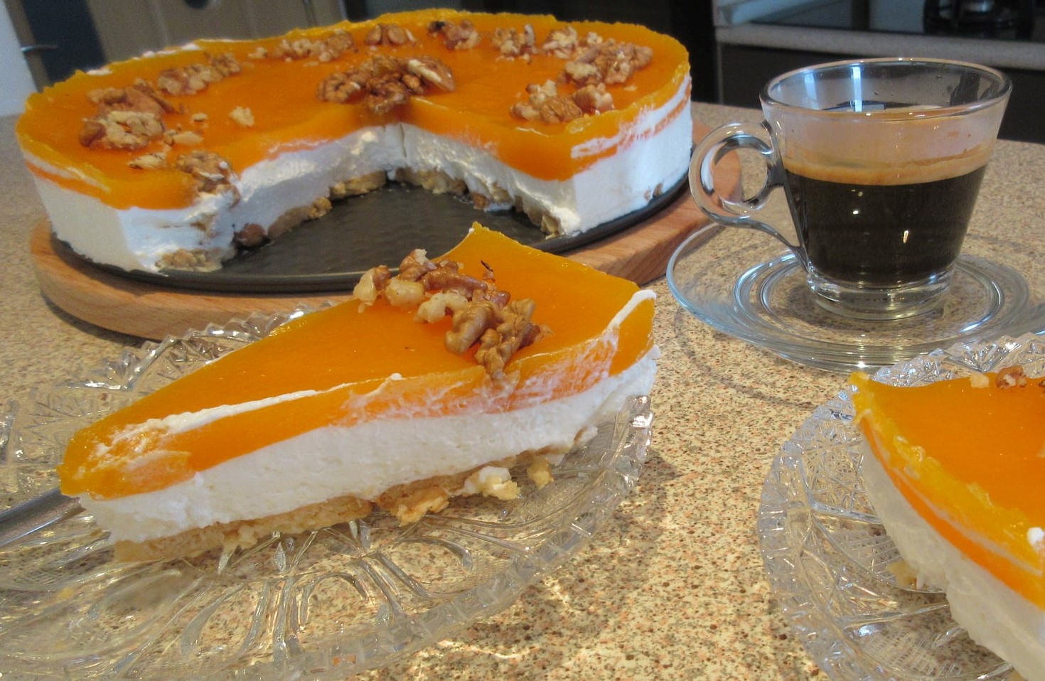 Ανακατεύουμε καλά και περιχύνουμε με αυτό τη λευκή κρέμα. Βάζουμε την τούρτα στο ψυγείο. Χρειάζεται να σταθεί τουλάχιστον δύο με τρεις ώρες για να σφίξει καλά η ζελατίνη. Πασπαλίζω με θρυμματισμένα καρύδια.