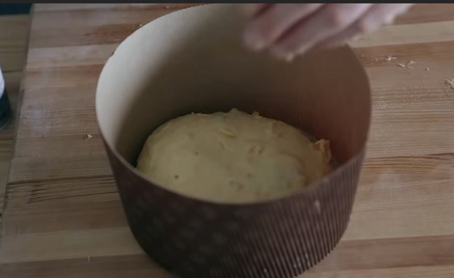 Ισομοιράζουμε την ζύμη σε 2 καλά βουτυρωμένες χάρτινες φόρμες μίας χρήσεως για πανετόνε 15Χ13εκ. ή σε μια μεγάλη φόρμα για πανετόνε. Η ζύμη πρέπει να καλύπτει στο 1/3 του σκεύους.
