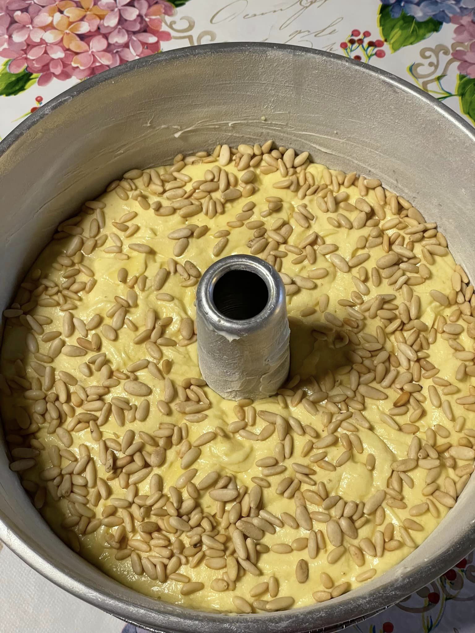 Χτυπάω τους κρόκους με τη ζάχαρη και το βούτυρο,προσθέτω τα υπόλοιπα,τέλος προσθέτω τα χτυπημένα ασπράδια, βάζω την κρέμα που αποκτήθηκε σε ένα ταψί,από πάνω βάζω 100 γρ. κουκουνάρι.