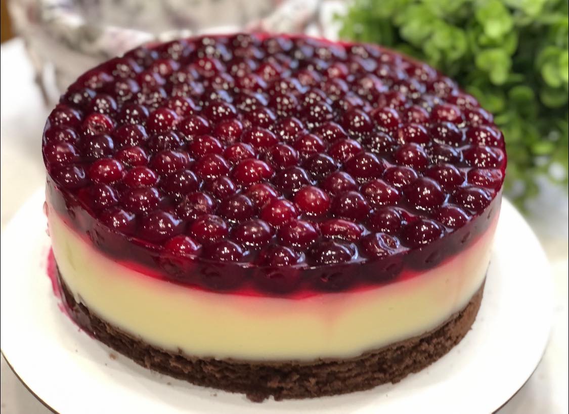Βγάλτε το κέικ από το ψυγείο και απλώστε τα κεράσια πάνω στην κρέμα. Ρίχνουμε το ζελέ σε δύο στάδια (ρίχνουμε το μισό ζελέ και βάζουμε το γλυκό στην κατάψυξη για 15 λεπτά).