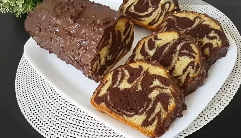 Σε μία βουτυρωμένη και αλευρωμένη φόρμα του κέικ ρίχνω το 1/5 του λευκό μείγματος στη συνέχεια ρίχνω το 1/4 σοκολατένιο μειγμα από πανω και μετά πάλι το λευκό και σοκολατενειο και τελειωνω με το λευκό (5 στρωσεις λευκό και 4 σοκολατενιο)
