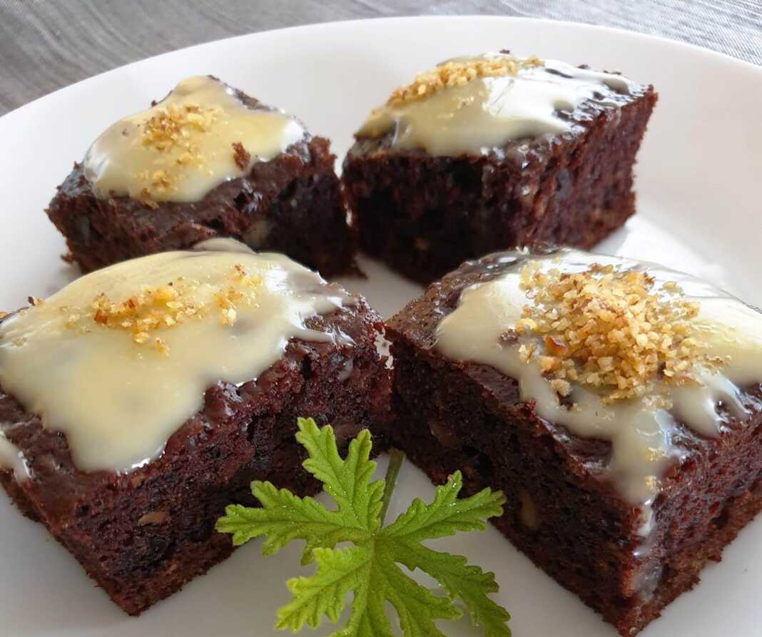 - Το γλάσο λευκής σοκολάτας προσθέτει μια γλυκιά αντίθεση στην έντονη σοκολάτα του κέικ.