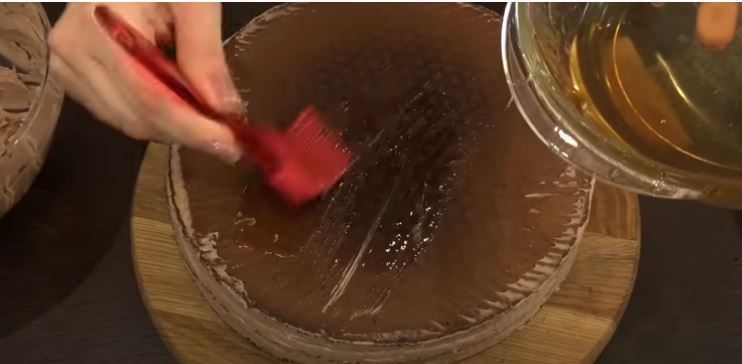 Πάρτε το σιρόπι κονιάκ. Εμποτίστε και τα τρία στρώματα.