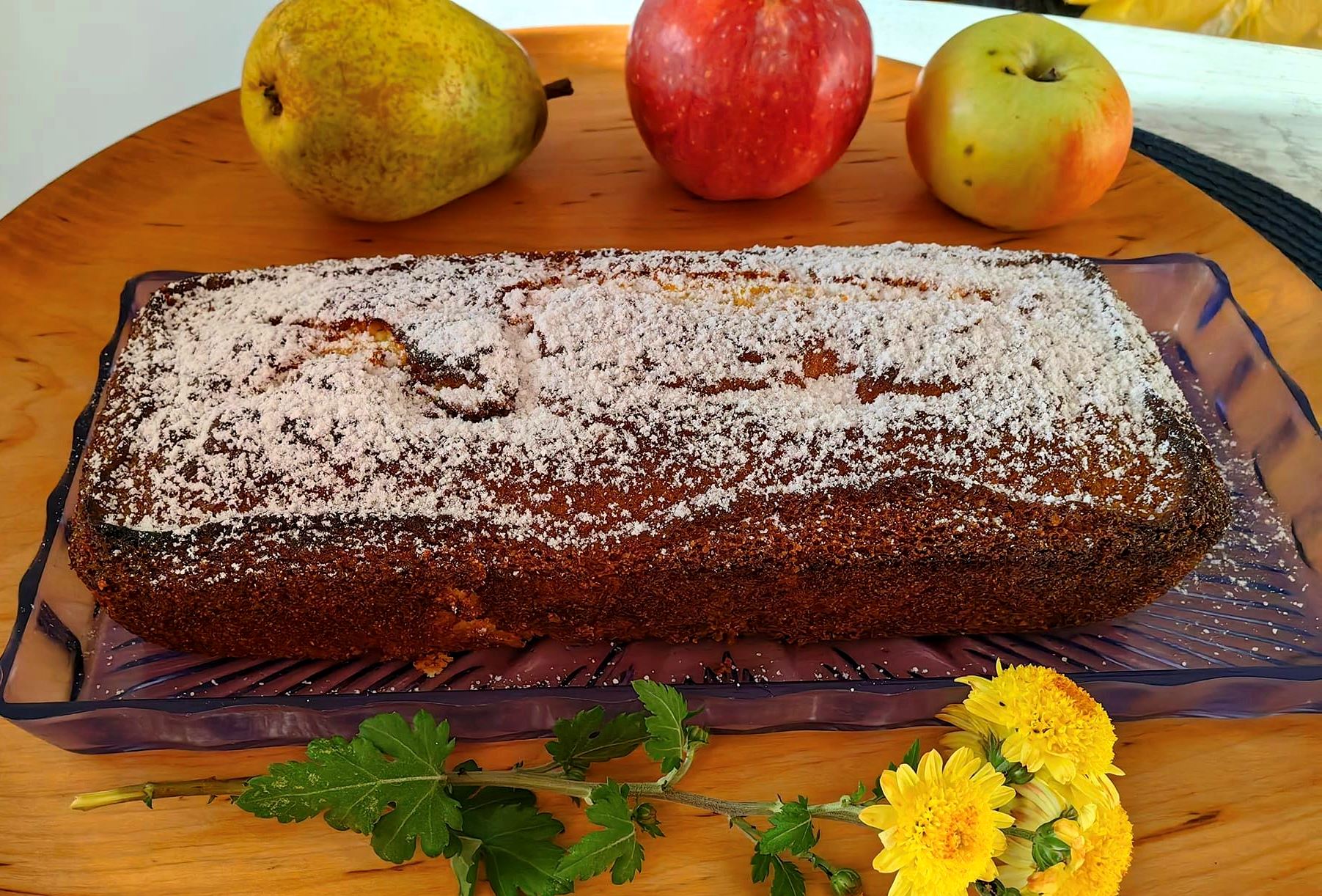 Πρώτα έτριψα το μήλο και το αχλάδι. Στη συνέχεια χτύπησα τα αυγά με τη ζάχαρη και πρόσθεσα το λιωμένο βούτυρο, το τριμμένο μείγμα, τη βανίλια, το μπέικιν πάουντερ και το γιαούρτι, ανακατεύοντας καλά.