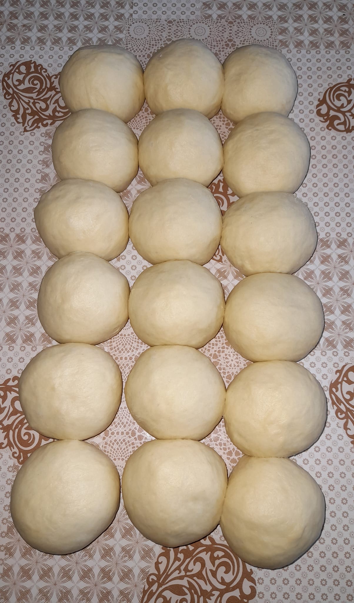 Καλύψτε με μια πετσέτα και αφήστε να φουσκώσει για 15 λεπτά. Χωρίζεται σε 18 μπάλες, σκεπάζετε και αφήνετε για 15 λεπτά.