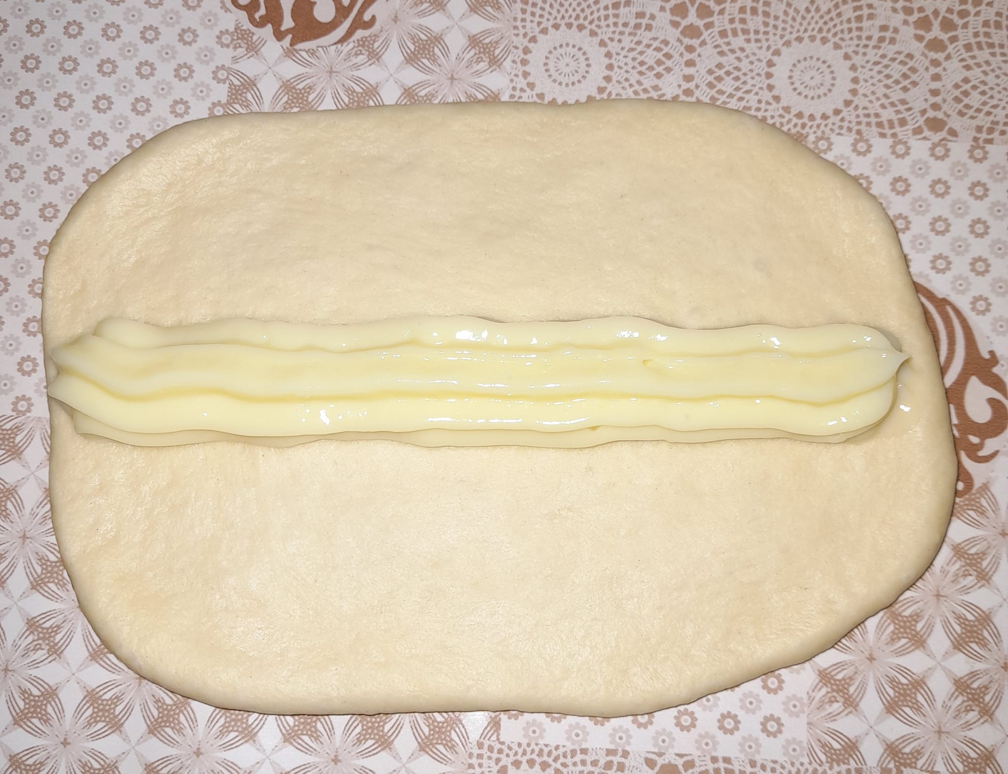 Ξεδιπλώστε τη ζύμη σε ορθογώνιο και απλώστε με κρέμα.