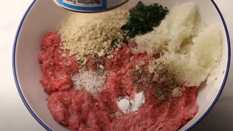 Ρίχνουμε την σόδα, αλάτι, κρεμμύδι, πιπέρι, μαϊντανό, τριμμένη φρυγανιά και