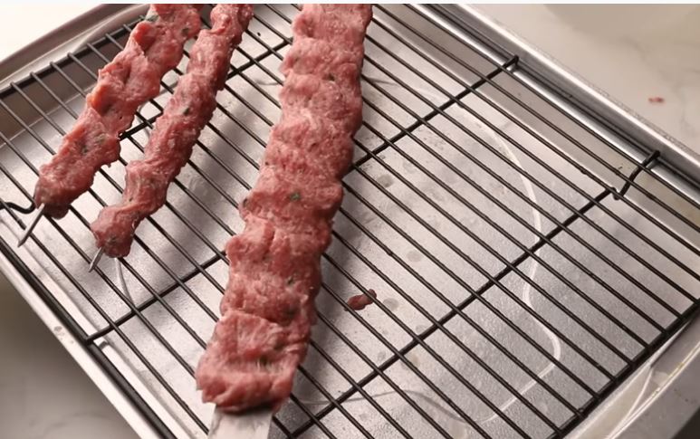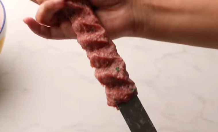 Βρέχουμε τα χέρια μας περνούμε μια δόση του μείγματος κιμα σε μέγεθος μικρου πορτοκαλιού και τα δάχτυλα το πλάθουμε πανω σε μια σουβλα για κεμπάπ ενω βρέχουμε τα χερια μας συνέχεια.