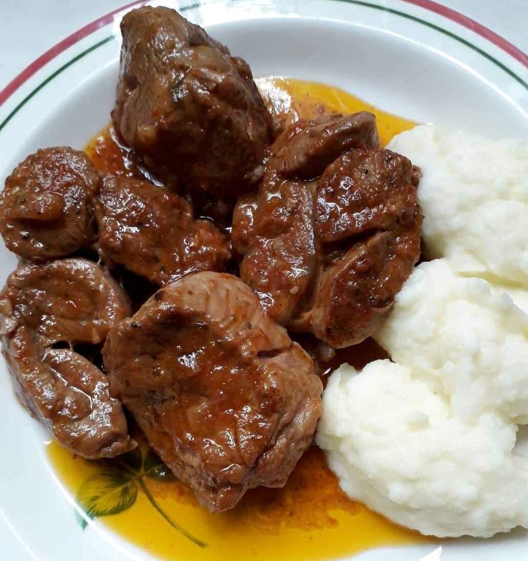 Τρυφερό μοσχαράκι σε μια πλούσια σάλτσα, συνοδευόμενο από απαλό πουρέ πατάτας. Ένα πιάτο που θα λατρέψεις!