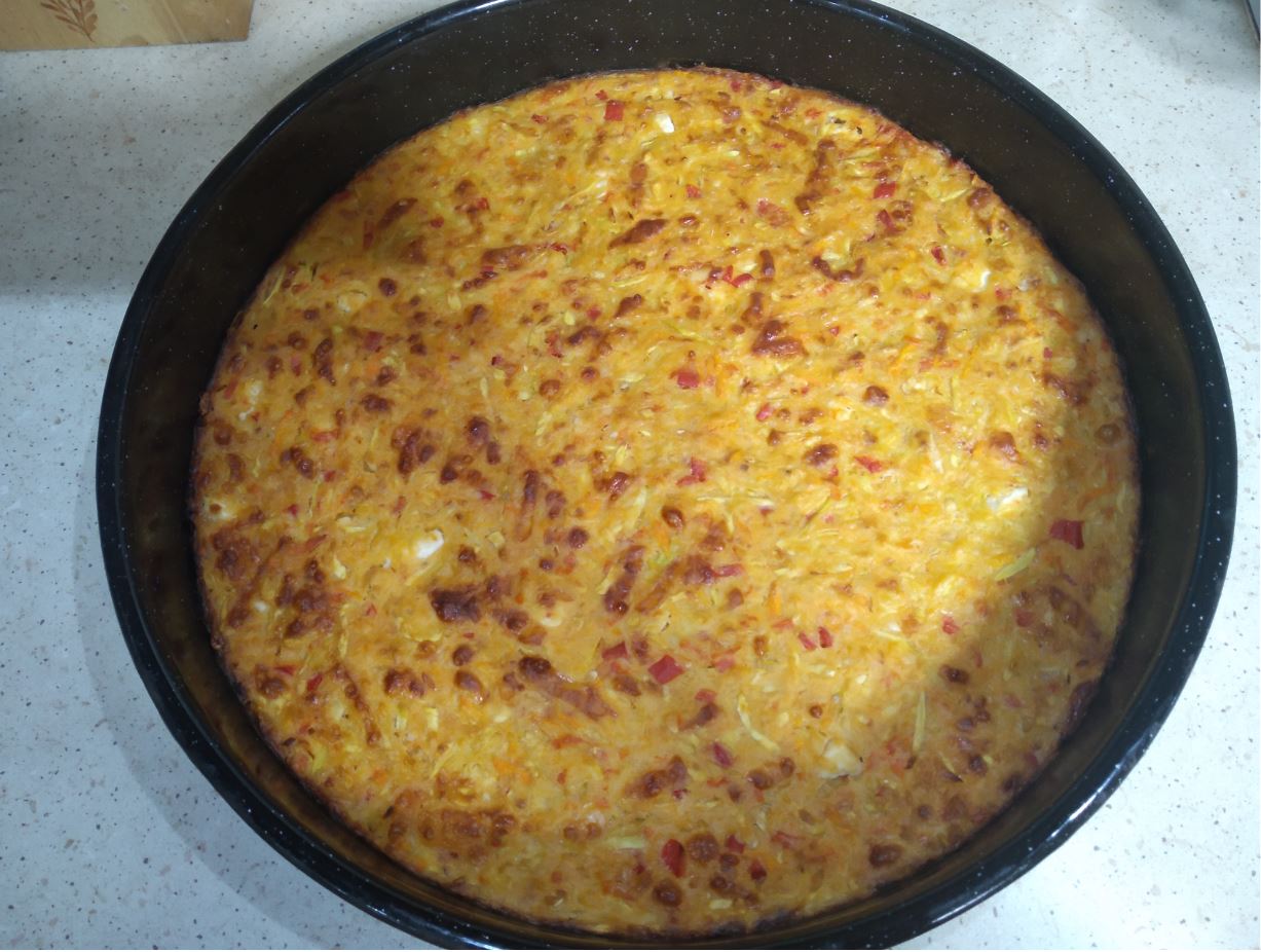Σε μια λεκάνη ρίχνω τα αυγά και τα χτυπάω. Έπειτα, προσθέτω το γάλα, το λάδι και τα καλά στυμμένα λαχανικά μου. Προσθέτω το σιμιγδάλι και τη φαρίνα και ανακατεύω καλά.