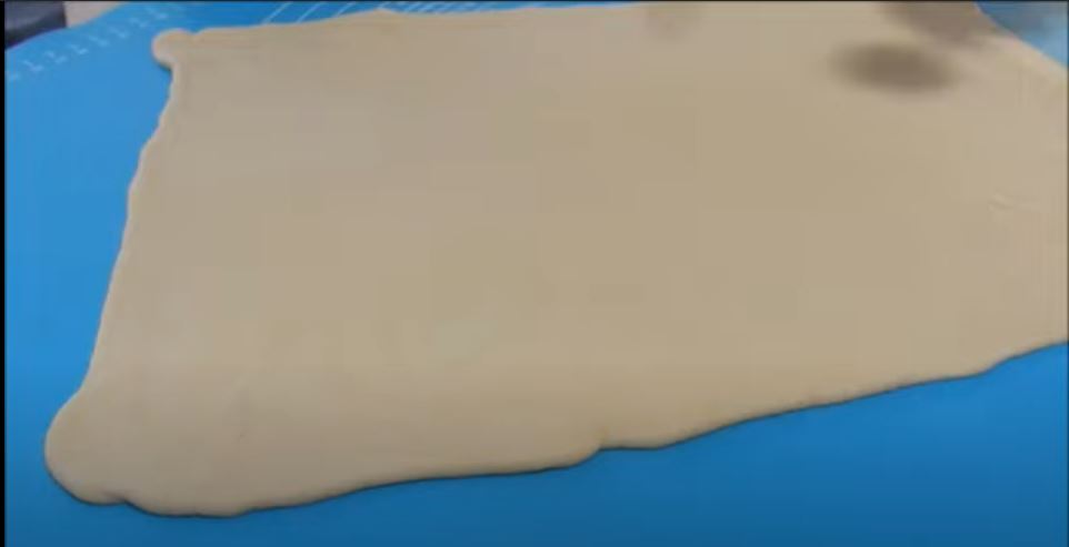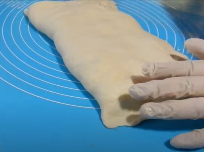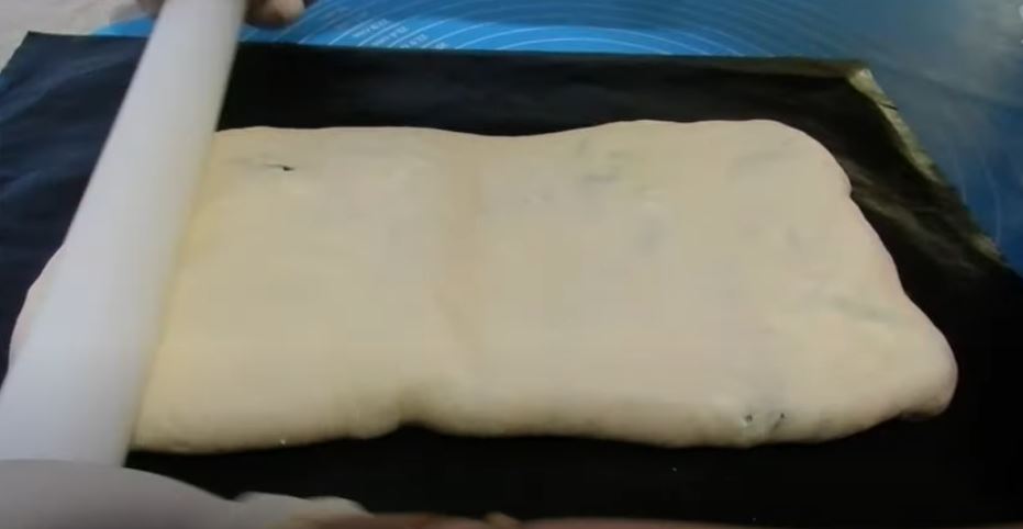 Βγάζουμε το ζυμώνουμε λίγο και το ισιώνουμε σε ένα παραλληλόγραμο.
