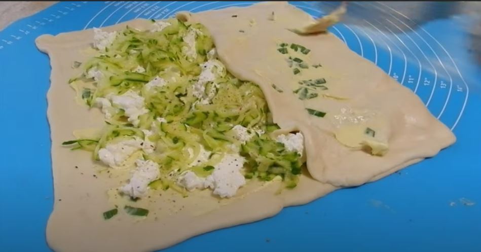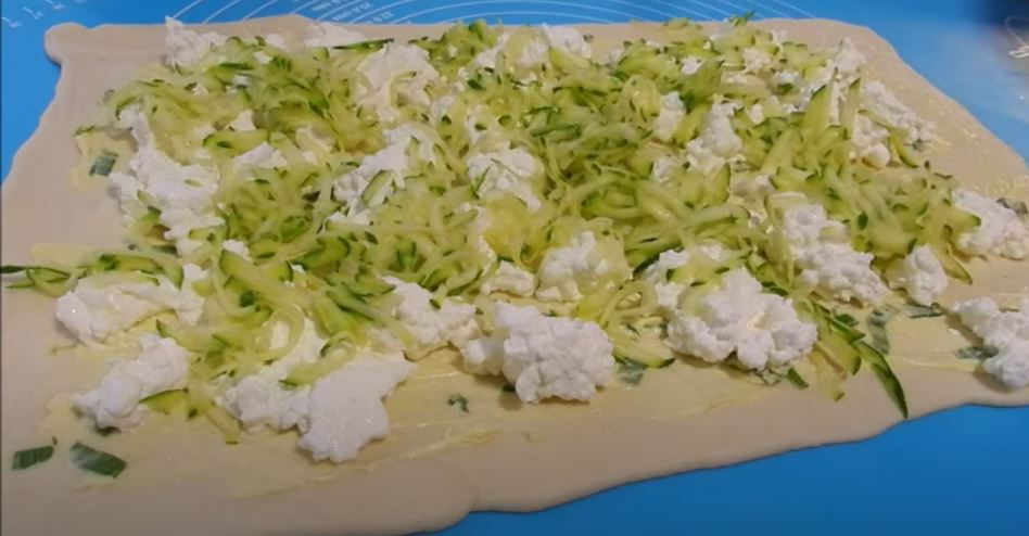 Απλώνουμε (αλλοιφουμε) το μείγμα βουτύρου πάνω στην σε όλη την ζύμη και από πάνω ρίχνουμε την φέτα. Από πάνω ρίχνουμε το τριμμένο κολοκύθι, και αλατοπιπερώστε.