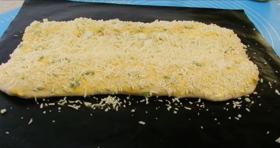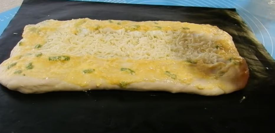 Σε αυτό το σημείο δίπλωσα τις 2 άκρες της ζύμης πασπάλισα με μπόλικο τυρί στην μέση και άπλωσα μετά το μείγμα αυγού και βουτυρο