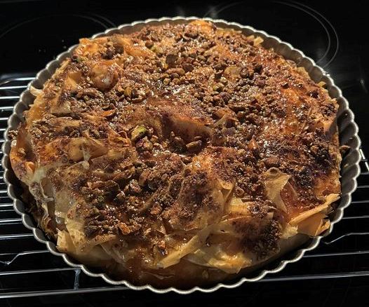 Ολοκληρώστε τη συναρμολόγηση της πίτας. Αλείψτε την επάνω στρώση φύλλου με λίγο βουτυρο και πασπαλίστε το υπόλοιπο μείγμα καρυδιού.