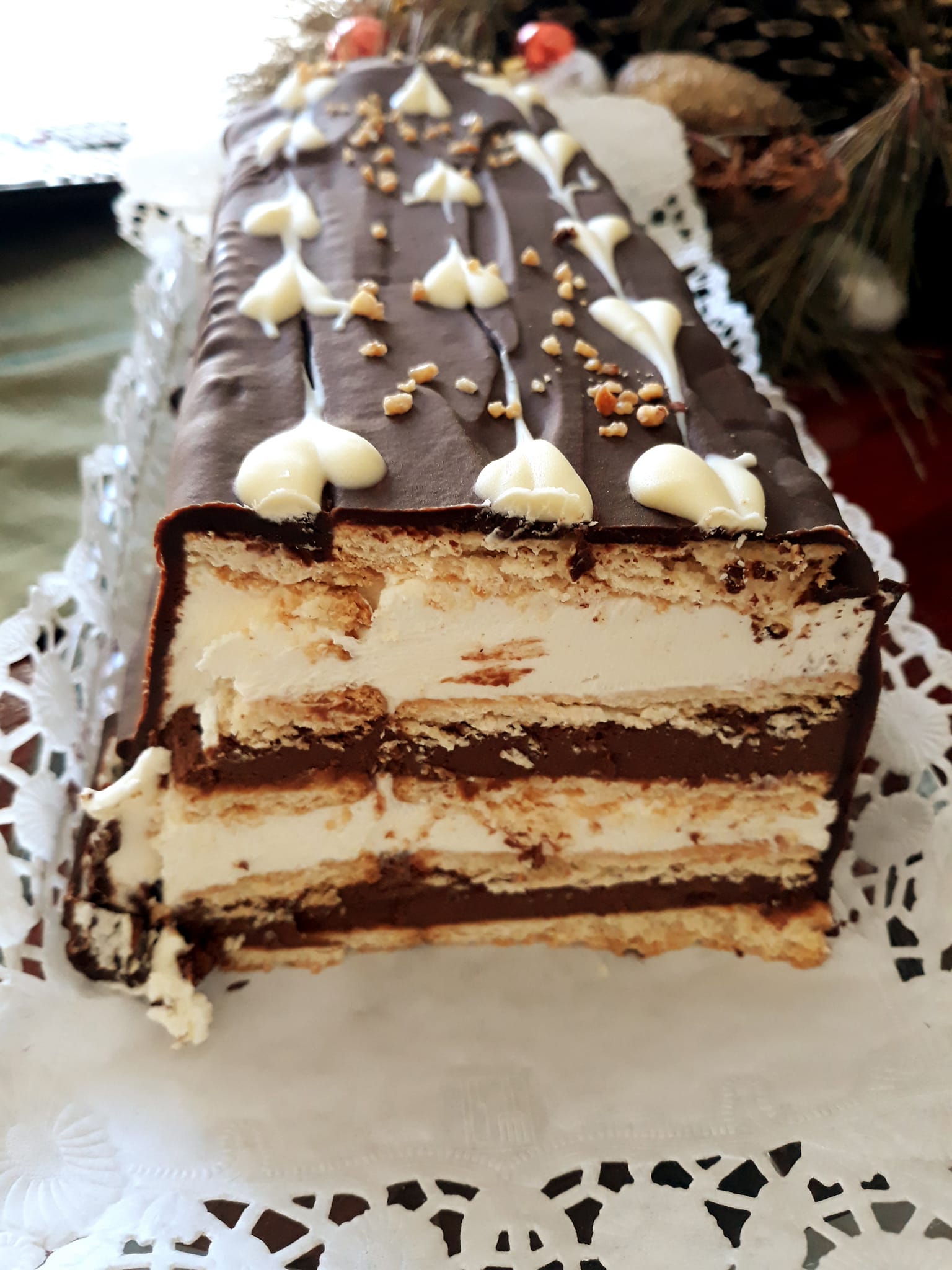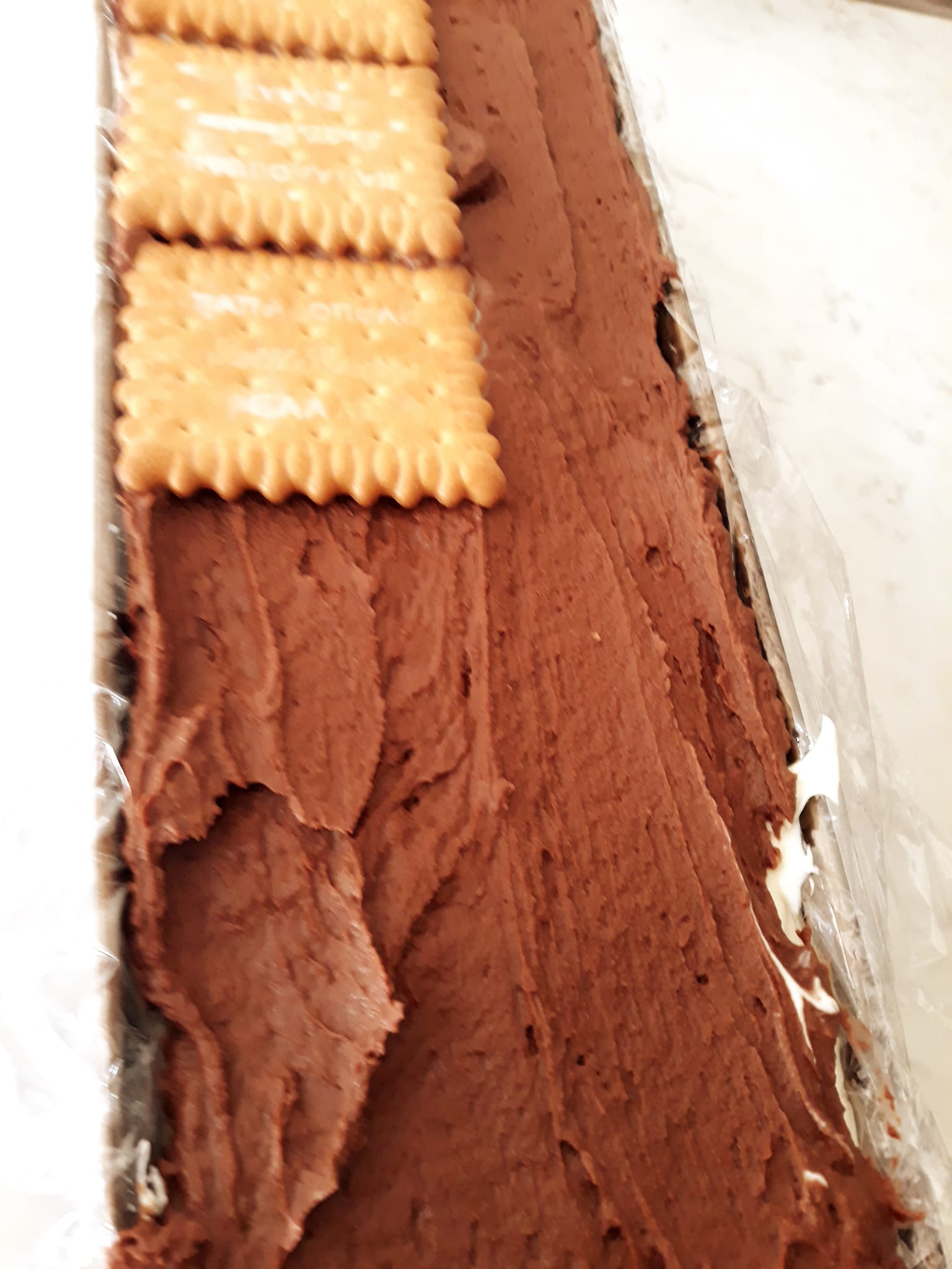 Επαναλαμβάνουμε με μπισκότα 1/2 μαύρη σοκολάτα – μπισκότα την υπόλοιπη λευκή σοκολάτα – μπισκότα – μαύρη σοκολάτα