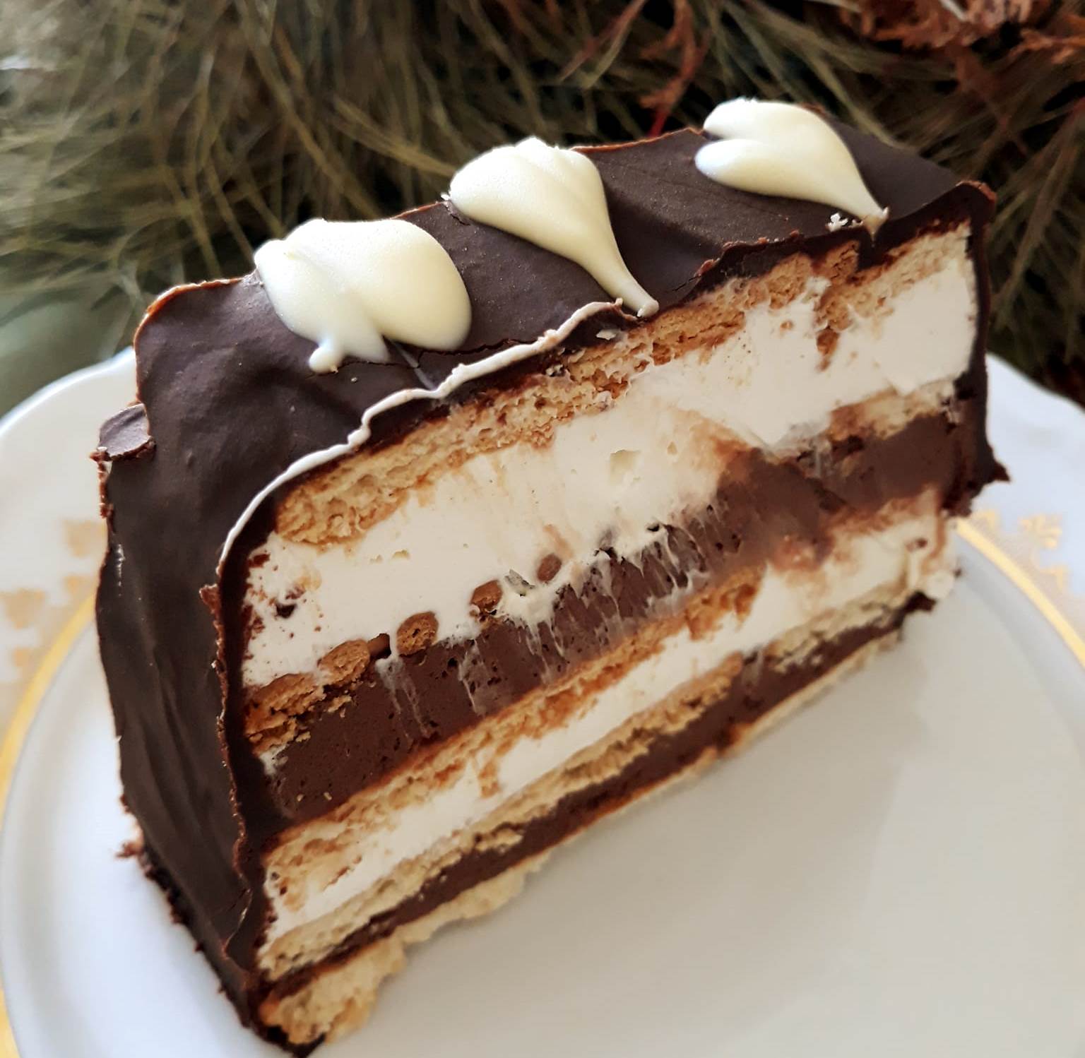 Επαναλαμβάνουμε με μπισκότα 1/2 μαύρη σοκολάτα – μπισκότα την υπόλοιπη λευκή σοκολάτα – μπισκότα – μαύρη σοκολάτα