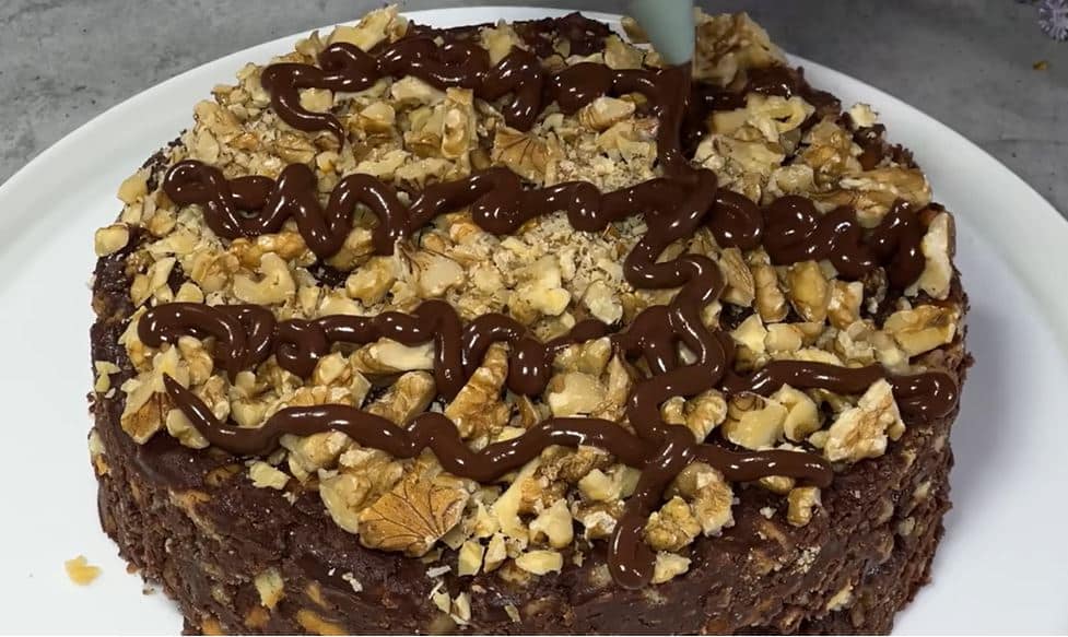 Πασπαλίζουμε καρύδια στην επιφάνεια του γλυκού αφαιρούμε το τσέρκι και περιχύνουμε με το γλάσο της σοκολάτας.Βάζουμε στο ψυγείο για 30 λεπτά.