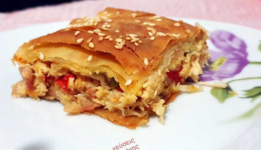 κοβουμε και το μπέικον. Μετά ξεψαχνιζουμε το κρέας και το κοβουμε με το χέρι μας σε μια λεκανιτσα. Βάζουμε λαδι σε ενα τηγανι και σοταρουμε τα κρεμμύδια, το μπέικον, τις πιπεριές και τέλος ριχνουμε το κοτόπουλο…. Ρίχνουμε αλάτι, πιπέρι και πάπρικα και τα αφηνουμε ολα μαζι να σοταριστουν για 5-6 λεπτά. Βγάζουμε την γέμιση την βαζουμε σε μια λεκανιτσα και προσθέτουμε τα αυγά και το τυρί…. λαδωνουμε ενα ταψί ( εγω εβαλα του φούρνου) στρώνουμε τα μισά φύλλα κατω λαδωνοντας τα εναλλάξ. Ριχνουμε την γεμιση και την απλωνουμε καλα να πάει σε ολο το ταψι. Από πάνω τοποθετουμε τα υπόλοιπα φυλλα λαδωνοντας τα και αυτά εναλλάξ . Χαράζουμε σε κομμάτια και ραντιζουμε από πανω με νερό και λαδι…. αν θελουμε πασπαλίζουμε με σουσάμι. Ψήνουμε σε προθερμασμένο φούρνο στους 180° C στον αερα για 45 λεπτά περίπου λεπτά…