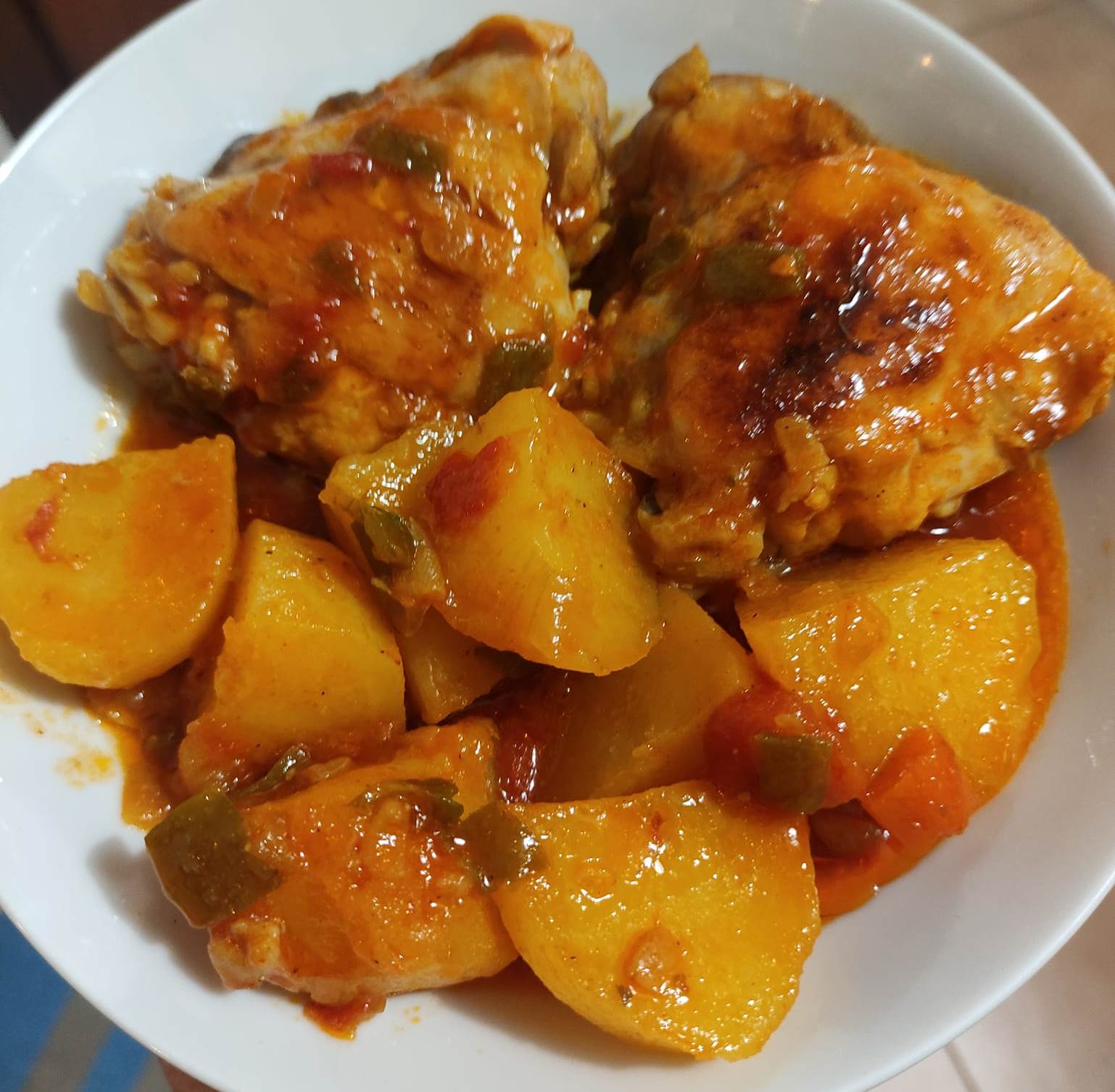 Σε ένα μεγάλο αντικολλητικό τηγάνι βάζετε το λάδι και το ψιλοκομμένο κρεμμύδι, το καρότο και την πιπεριά, τα ροδίζετε λίγο, προσθέτετε τα μπούτια (αφαιρώ την πέτσα, δεν μας αρέσει), τα ροδίζετε και από τις δύο πλευρές, προσθέτετε τα μπαχαρικά, την ντομάτα και τον πελτέ και τα μαγειρεύετε για 20 λεπτά.