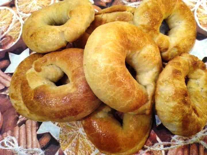 Στη συνέχεια προσθέτουμε το λάδι και κοσκινίζουμε σταδιακά το αλεύρι μέχρι να γίνει μια μαλακή και λεία ζύμη. Από αυτό κόβονται μπάλες, απλώνονται, αλείφονται με τυρί κρέμα, τυλίγονται και πλάθονται κουλούρια τα βάζουμε σε ταψί καλυμμένο με χαρτί ψησίματος, αλείφουμε με ένα χτυπημένο αβγό και, χωρίς να
