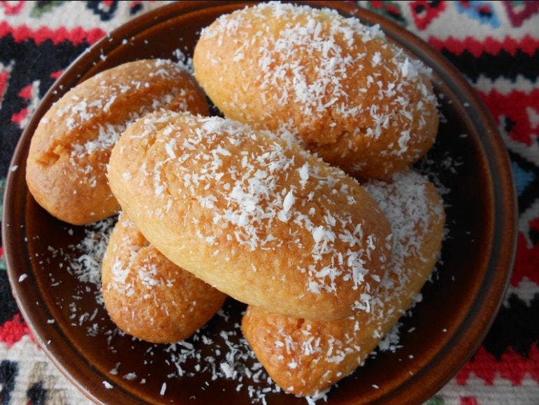 Σε ένα μπολ χτυπάμε με σύρμα τα αυγά και τη ζάχαρη. Προσθέτουμε το λάδι, την καρύδα, το μπέικιν πάουντερ και το αλεύρι.