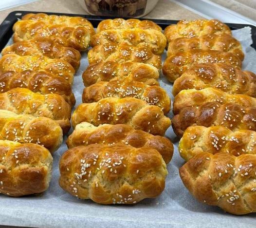 Αφησα τη ζύμη 15 λεπτά να ξεκουραστει επλασα και αλειψα με κρόκο και πασπαλισα με σουσάμι έψησα σε προθερμασμενο φούρνο στους 180 αέρα στο περίπου 20 λεπτά μέχρι να ροδίσουν.