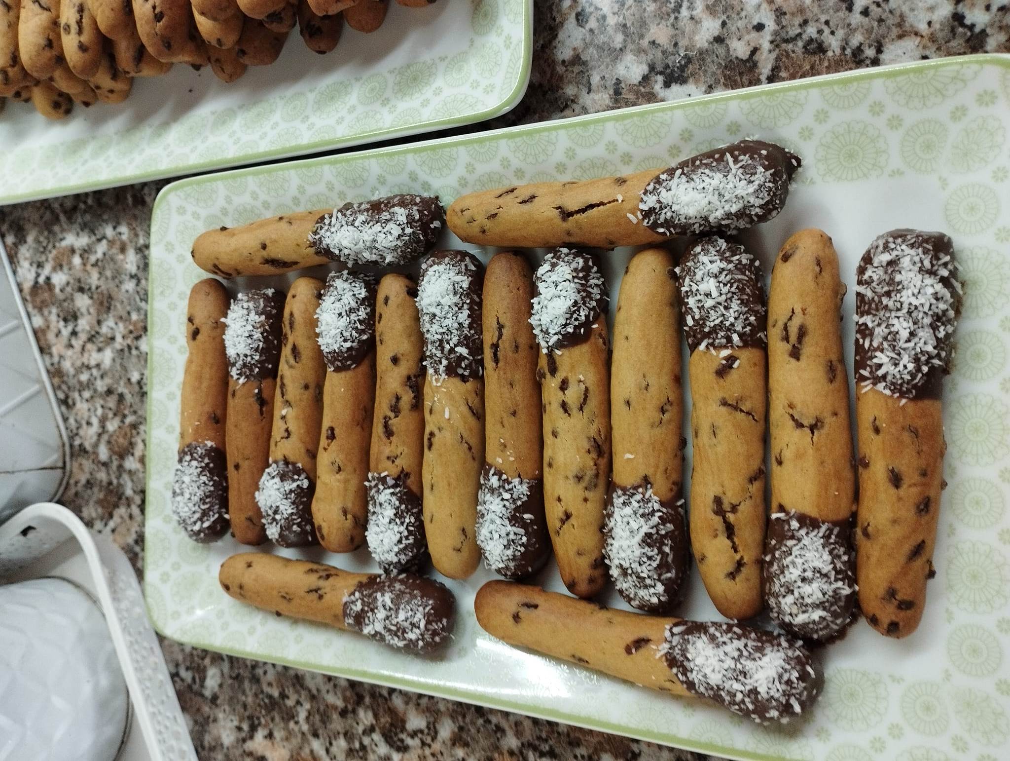 8. Βουτάμε τις άκρες των μπαστουνιών στη λιωμένη σοκολάτα και αν θέλουμε πασαλίζουμε με καρυδα..