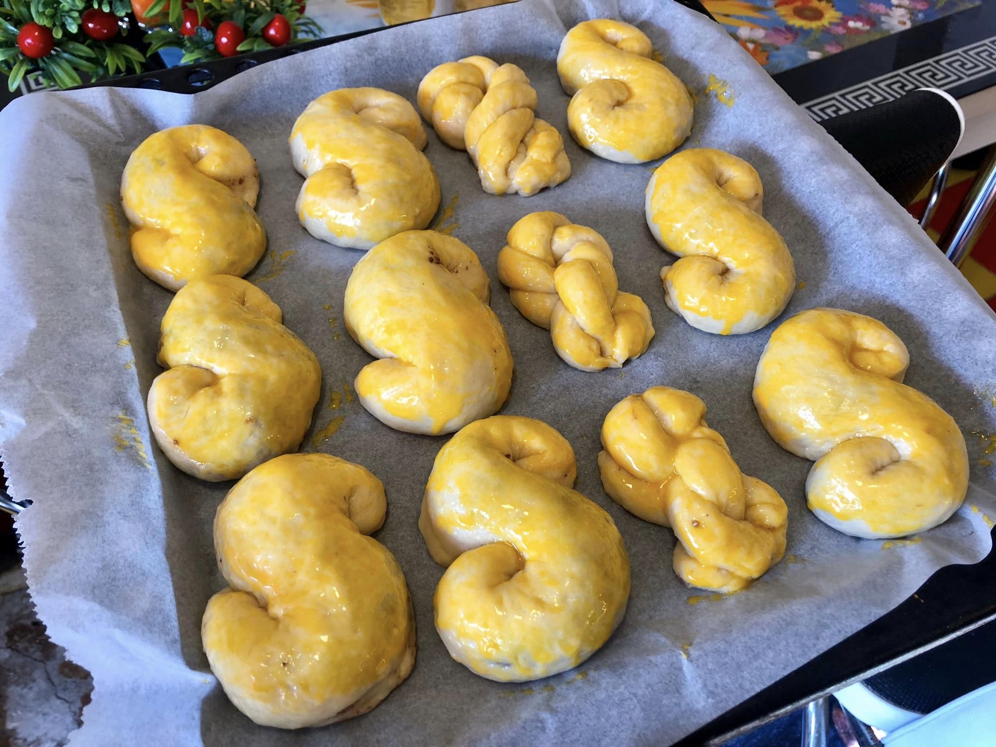 Αφού σηκωθούν φουσκώσουν τα κουλουράκια στο ταψί, Τα αλείφουμε με τους χτυπημένους κρόκους αυγού και τα βάζουμε στο φούρνο για 30 λεπτά στους 180 βαθμούς.