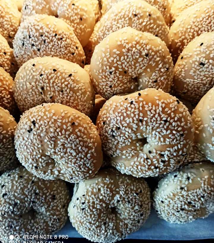 Το αφήνουμε πάνω σε σανίδα με ένα καθαρό σεντόνι και σκεπασμένα με άλλο ένα από πάνω σε ζεστό χώρο μέχρι και 25 βαθμούς θερμοκρασία όταν έχουν διπλασιαστεί σχεδόν, τα βουτάμε σε βραστό νερό τα περνάμε με σουσάμι και τα βάζουμε για ψήσιμο….