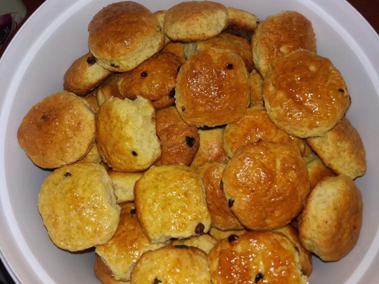 Κοσκινίστε όλα τα ξηρά συστατικά σε ένα μπολ, προσθέστε το βούτυρο, στη συνέχεια ανακατεύουμε μέχρι να μοιάζει με ψίχουλα ψωμιού, προσθέστε τις σταφίδες και ανακατέψτε καλά.
