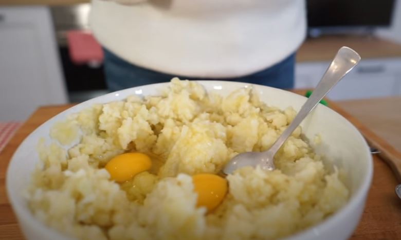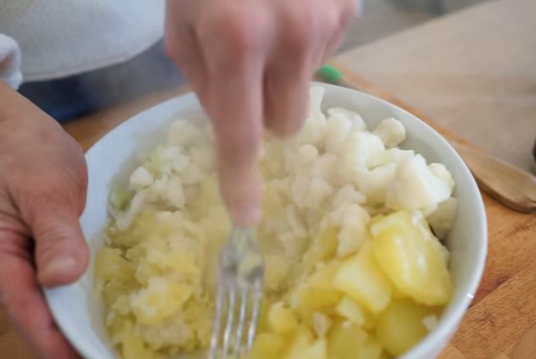 Αφαιρούμε απο το νερό κουνουπίδι και πατάτες σε ένα μπολ και σε αυτό το σημείο τα λιώνουμε όλα μαζι με ένα πηρούνι και αναμειγνύονται μαζι κουνουπίδι και πατάτα.
