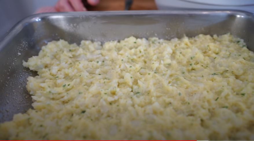Λαδώνω ένα ταψακι (24χ40 εκ) παντού , πασπαλίζω να το καλύψω με φρυγανιά τριμμένη και παίρνω μικρές δόσεις απο το μείγμα πατάτας-κουνουπίδι και στρώνω την βάση του ταψιού.