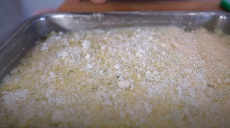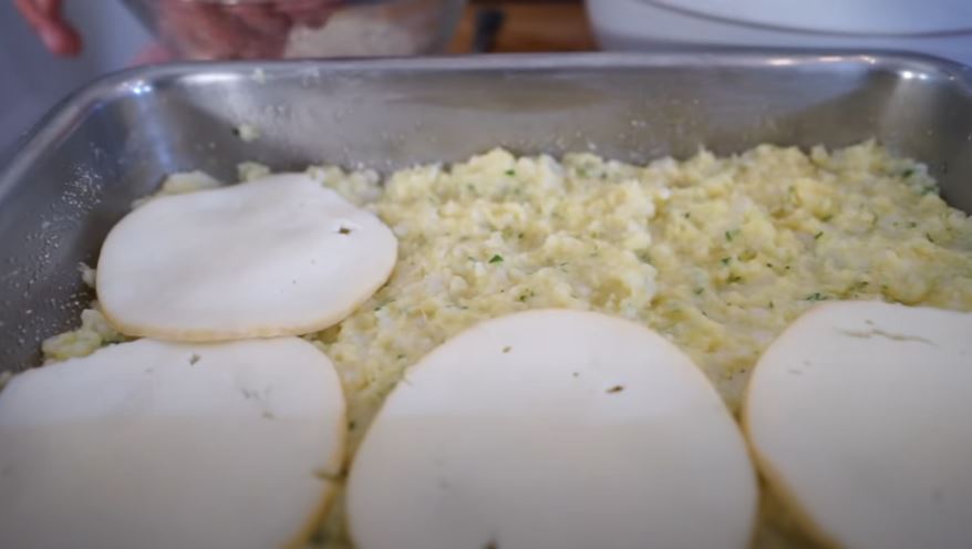 Κάνω ένα δεύτερο στρώμα με τις φέτες καπνιστού και απο πάνω δεύτερο στρώμα του μειγματος, και απο πάνω πασπαλίζω τριμμένη παρμεζάνα και μετα και τριμμένη φρυγανιά.