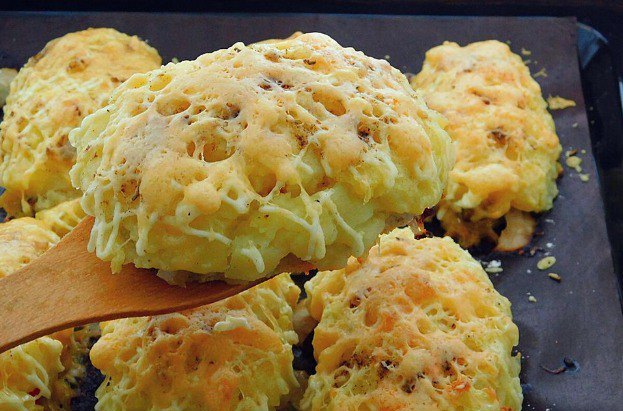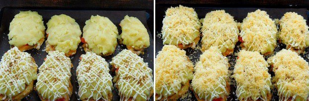Στη συνέχεια, καλύψτε τα πάντα με πουρέ πατάτας. Απλώστε ένα πλέγμα μαγιονέζας. Λίγο καρύκευμα.