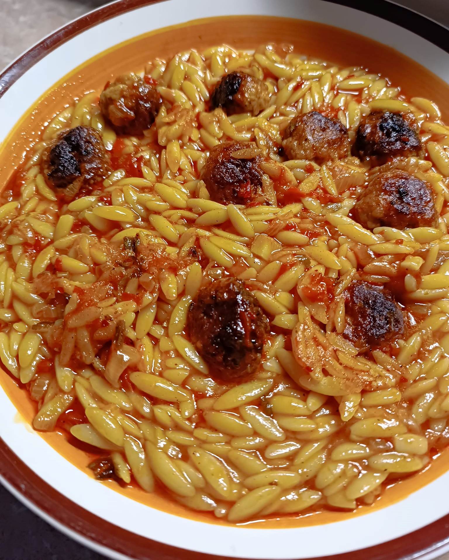 Το σιγοβρασμένο κρεμμύδι και σκόρδο στη σάλτσα δίνουν μια απίστευτα πλούσια γεύση στο κριθαράκι με κεφτεδάκια.