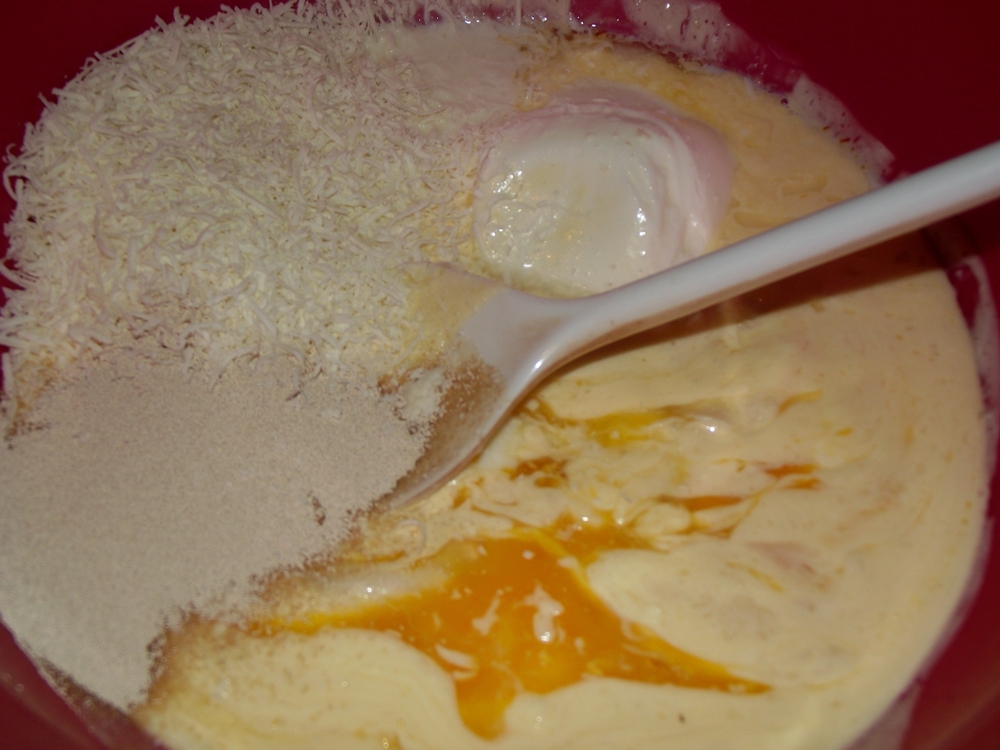 Βάλτε το λιωμένο και δροσερό βούτυρο και το λαρδί σε ένα μπολ. Εάν δεν έχετε λαρδί, προσθέστε βούτυρο. Χτυπημένα αυγά, γάλα, γιαούρτι, τριμμένο τυρί και μαγιά.