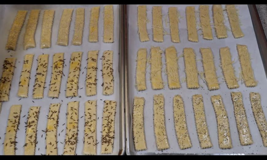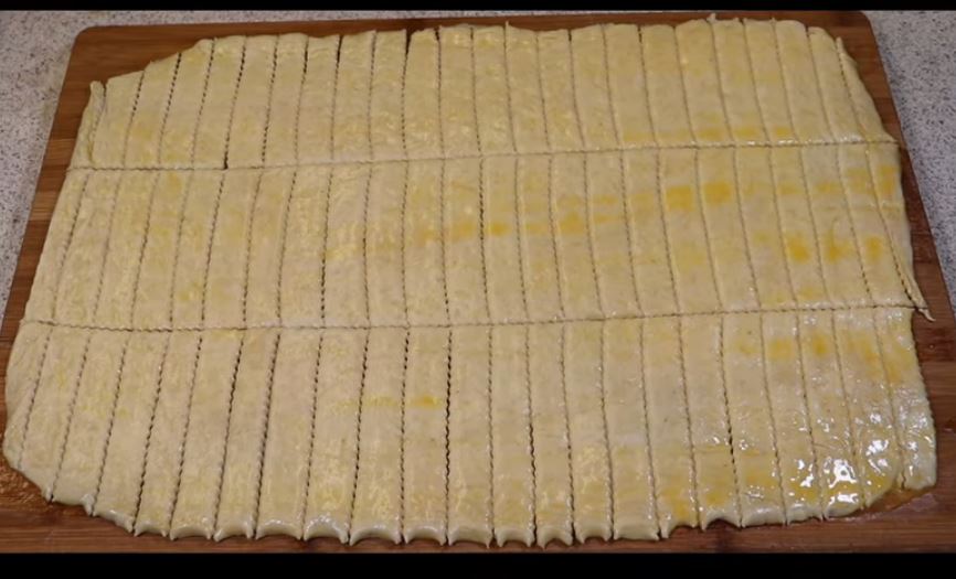 Με ένα καλά ακονισμένο μαχαίρι ή ένα ειδικό ρολό, σχεδιάζουμε κάθετες γραμμές σε απόσταση περίπου ίση μεταξύ τους κατά μήκος ολόκληρου του πλάτους της ζύμης, και στη συνέχεια χαρασουμε μια γραμμή στη μέση (μπρουμε να τα κάνουμε και μικρότερα με 2 γραμμες), λαμβάνοντας έτσι τα κριτσίνια.