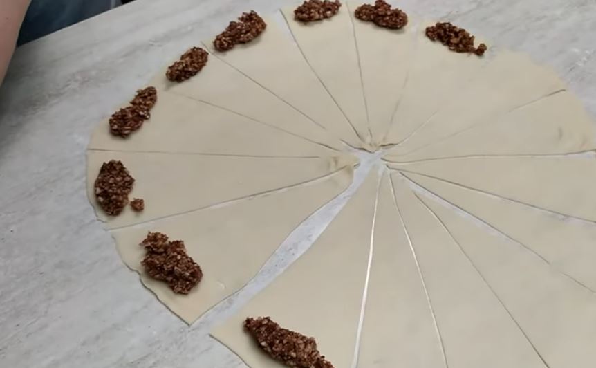 Σε κάθε ένα τριγωνάκι βάζουμε γέμιση και το τυλίγουμε κρουασάν ψήνουμε στους 180 βαθμούς για 15 λεπτά Αφήνουμε να κρυωσουν και τα ρίχνουμε μέσα σε ενα μπολάκι με ζαχαρη άχνη και τ ανακατευουμε.