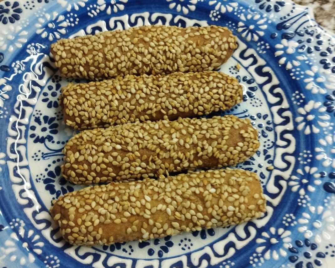 Κάνω μπαλάκια στο μέγεθος καρυδιού,στη συνέχεια τα πλάθω μπαστουνακια τα περνάω από το σουσάμι και τα αραδιαζω σε ταψί στρωμένο με λαδόκολλα
