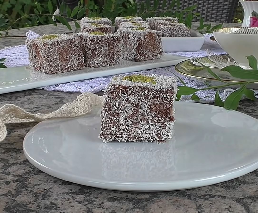 Κόψτε το κέικ σε κυβουμε πάρτε ένα-ένα κύβο βυθίστε τον στην σοκολάτα και μετα σε ένα πιάτο με τριμμένη καρύδα