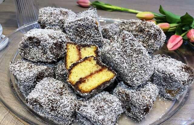 Lamingtons: Τα παραδοσιακά αυστραλέζικα γεμιστά, μικρά κέικ που γεμίζουν με μαρμελάδα και καλύπτονται με κακάο και τριμμένη καρύδα!